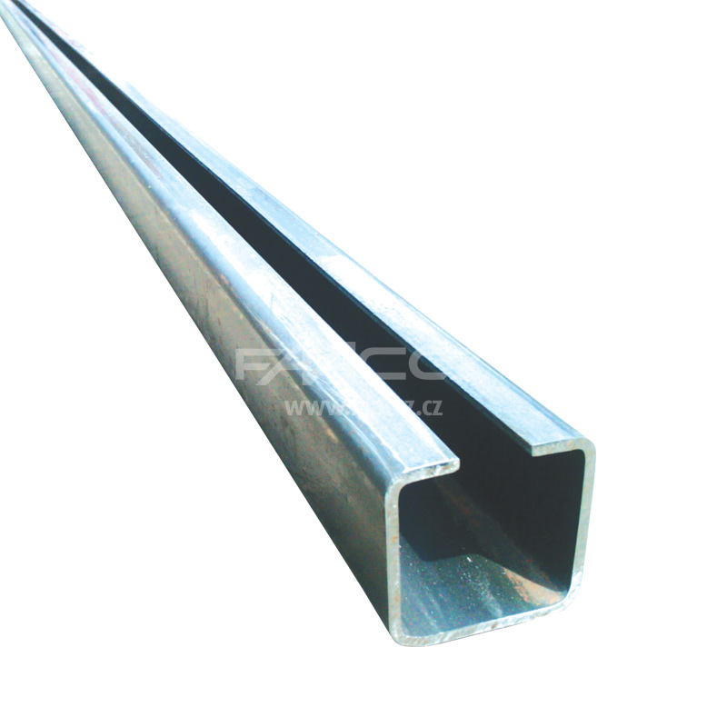 Černý kovový / pozinkovaný C-profil o rozměru 80 × 80 × 5 mm a délce 6 m nebo 7 m.